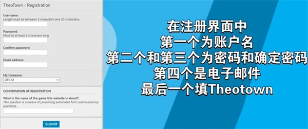 3、进入注册界面后,第一个输入框填写账户名,第二个和第三个分别是密码与确认密码,第四个输入框需填写电子邮箱,最后一个输入框请填入“Theotown”。