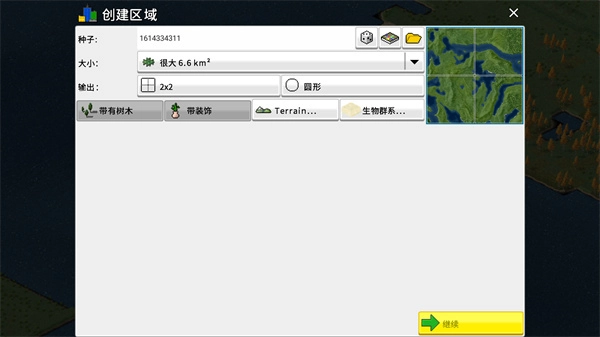 2、接着对地图属性进行设置,例如添加树木、装饰等元素,之后点击右下角的“继续”按钮。