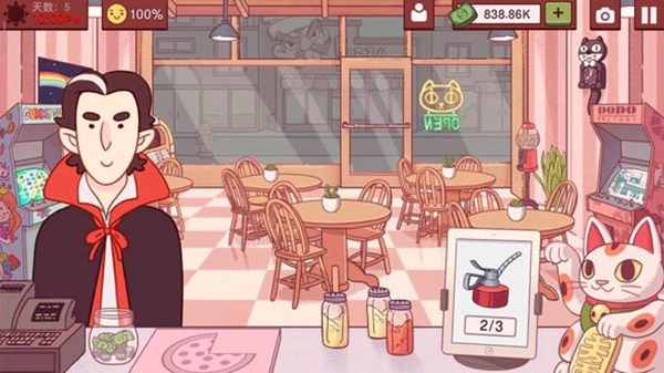 1、桌上角的太阳代表时间,当到达9:00后我们就下班了,旁边数值代表客人的耐心度,当跌到50%的时候客人就不会给小费了,右边是我们的金额。