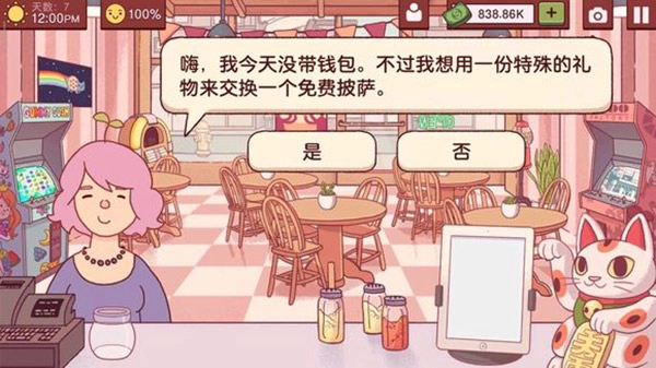 3、有一个粉色头发头上有颗草的姐姐要用特殊礼物换免费披萨。点“是"给她做什么都可以。我做的是酱料+芝士+意大利辣肠。送了一个花盆,可以种出来茄子。