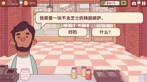 7、这个肩膀上有乌鸦的要猪肉爱好者披萨,解锁了培根和火腿的注意了,如果他给的是13块,就酱料+芝士+意大利辣肠+猪肉粒即可。如果给的是15块,就酱料+芝士+辣肠+猪肉粒+培根+火腿。还没有解锁培根和火腿的就酱料+芝士+意大利辣肠+猪肉粒就ok。
