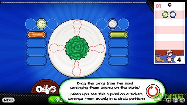 7、炸鸡裹匀酱料后,玩家得把它放到盘子里进行摆盘