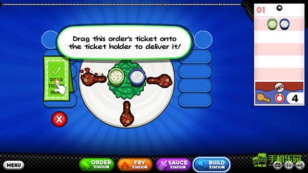 8、摆盘完成后,玩家把客人的下票贴在牌子上即可给客人上餐;