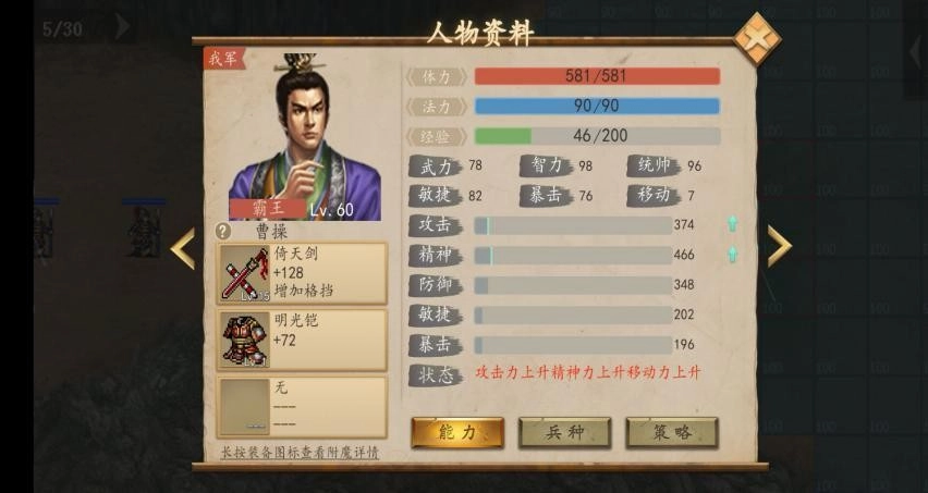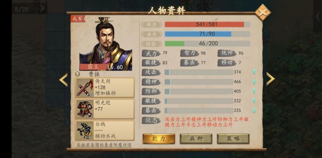 剧情中获得青釭剑(固伤属性),夏侯廉加入;第42关夏侯廉战死后,夏侯尚将继承其五维属性。
