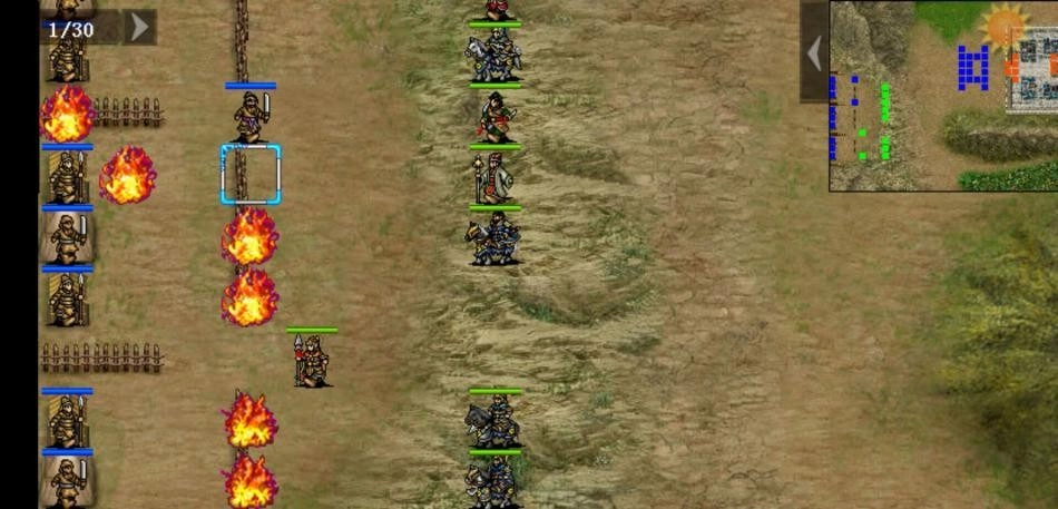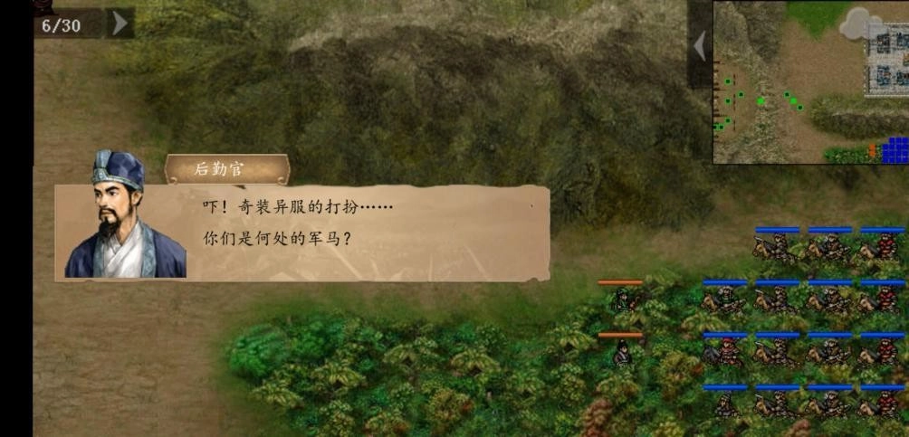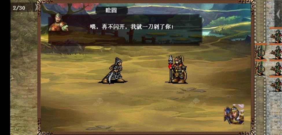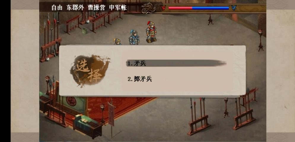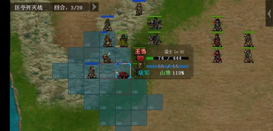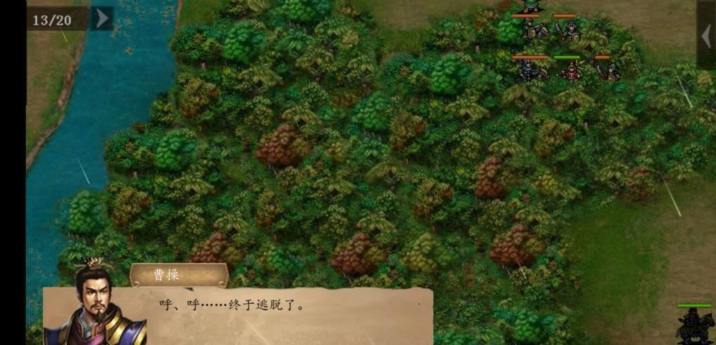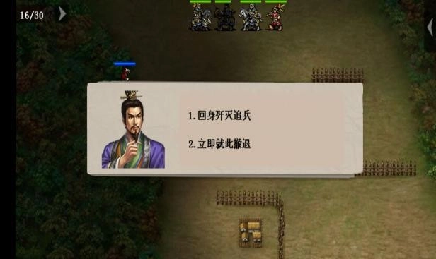 直接发起冲锋即可!负责殿后的敌方单位配置有变化:普通难度下是两名刀兵加一名剑兵,休闲难度则换成两名矛兵加一名剑兵,需要留意刀兵具备无法被反击的攻击特性。当敌方任意一名杂兵被击倒后,敌方主将的亲属(负责治疗的单位)以及夏侯氏兄弟会迅速移动到主将身边提供支援,同时回合限制会增加到40回合。彻底清除殿后的敌人后,敌方的桓姓将领就会率领麾下部队主动发起进攻。战斗时依然要注意地形因素,尽量避免在荒地作战——那里是敌方枪兵的优势地形,对我方曹操率领的部队不利。若我方主将与桓姓将领相邻,会触发特殊对话,之后桓姓将领的生命值会减少50点。成功击败桓姓将领后,敌方的卞姓军乐师会逃往我方主将附近,此时只要将所有敌人消灭就能完成关卡。