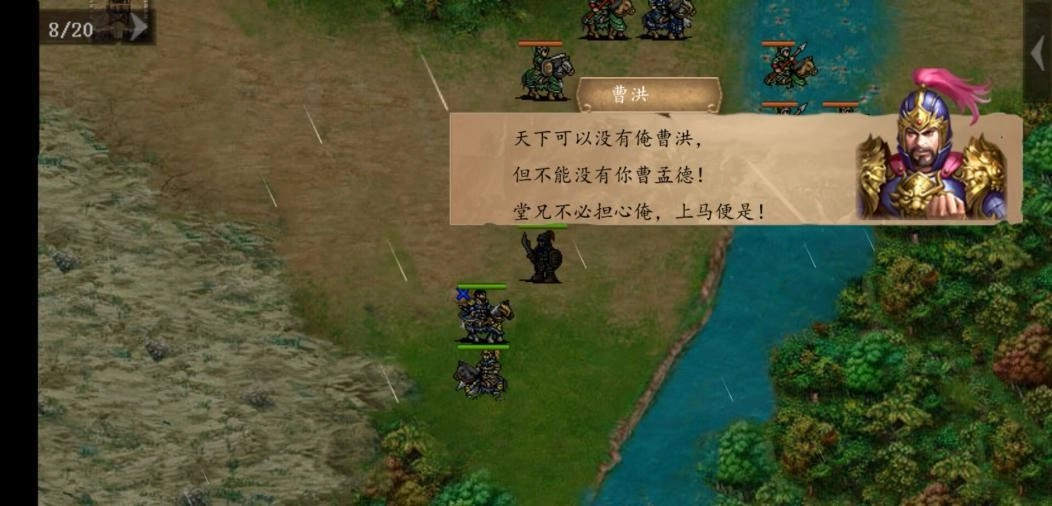 战场:开局鲍信带着骑兵从右上角追击敌军,我军会在第三回合从右上角进场。了解这段历史的玩家应该清楚,曹操此战中了徐荣的埋伏。不过不用慌,我军战斗力比友军强,肯定得跟着友军推进,尤其是夏侯惇、曹操、曹洪这三人——夏侯惇战力极强,还能和徐荣单挑降低对方防御;曹操和曹洪则需要触发剧情才能拿到白鹄。别问为什么选白鹄不选龙鳞甲,白鹄在水战地形能提供120的适应性加成,比侧重MP防御的龙鳞甲实用多了。第四回合左右,鲍信差不多就到了埋伏点,徐荣会登场,带着人马从上下两路包抄鲍信部;我军继续往前推进,到第五回合敌军行动阶段时,我军后军的上下两侧也会被敌军包抄,此时会出现选项。
