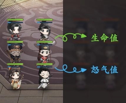 怒气技:门客在战斗时,能借助时间流逝或部分技能来积累怒气;当怒气值(即下图里的“蓝条”)达到要求后,就能释放该门客对应的怒气技了。