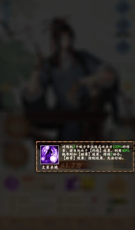 就像陆游的怒气技效果,能对带有【灼烧】状态的目标额外附加1回合的【眩晕】控制;要是搭配上能够提供【灼烧】状态的门客,陆游的怒气技就兼具了“伤害+控制”的双重作用。