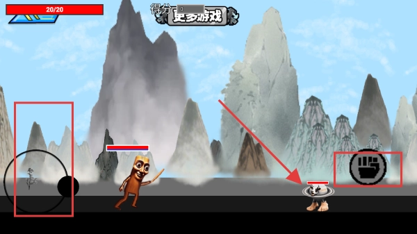 3、于游戏的战斗场景里,借助左侧的虚拟摇杆来操控角色移动,点击右侧的攻击按钮,朝着红色箭头所指向的敌人展开攻击,成功击败敌人即可获取得分。