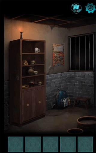【启】墙上那幅写着“柴米油盐酱醋茶”的画像→柜子背面的图案指示左右方向→按“右右左左左右右”操作→找到擀面杖和锤子→取墙旁的链子→从书包里拿出衣服→把衣服浸过水→将湿衣服绑在铁栏上→用擀面杖拧开(相关部件)→成功出去