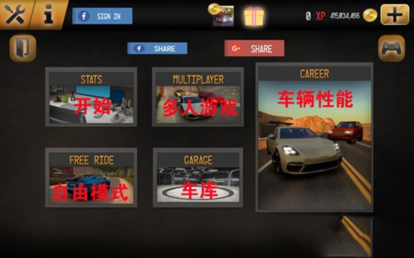 进入《驾驶学校2017》游戏后,会弹出系统面板,上面的选项分别对应开始游戏、多人游戏、自由模式、车库以及车辆性能等功能。
