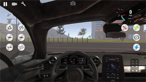 屏幕左侧依次排列着启动按钮、雾灯、大灯、喇叭、危险警示灯、左右转向灯以及通话器等功能按键,右侧则设有后视镜、视角转换、驻车雷达、雨刷、变速器、手刹和速度指示表等操作模块,所有这些都支持通过点击来实时查看相应的功能效果。