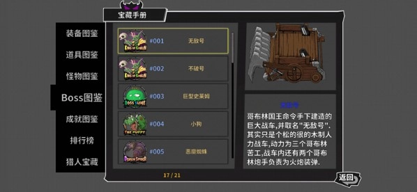 在「哥布林塔楼」这张地图里,会遇到四种不同的BOSS,分别是『无敌号』、『不破号』、『巨型史莱姆』和『小狗』。因为『无敌号』和『不破号』所掉落的武器都属于“哥布林”系列,所以在后面的内容中,这两个BOSS会被放在一起进行介绍。