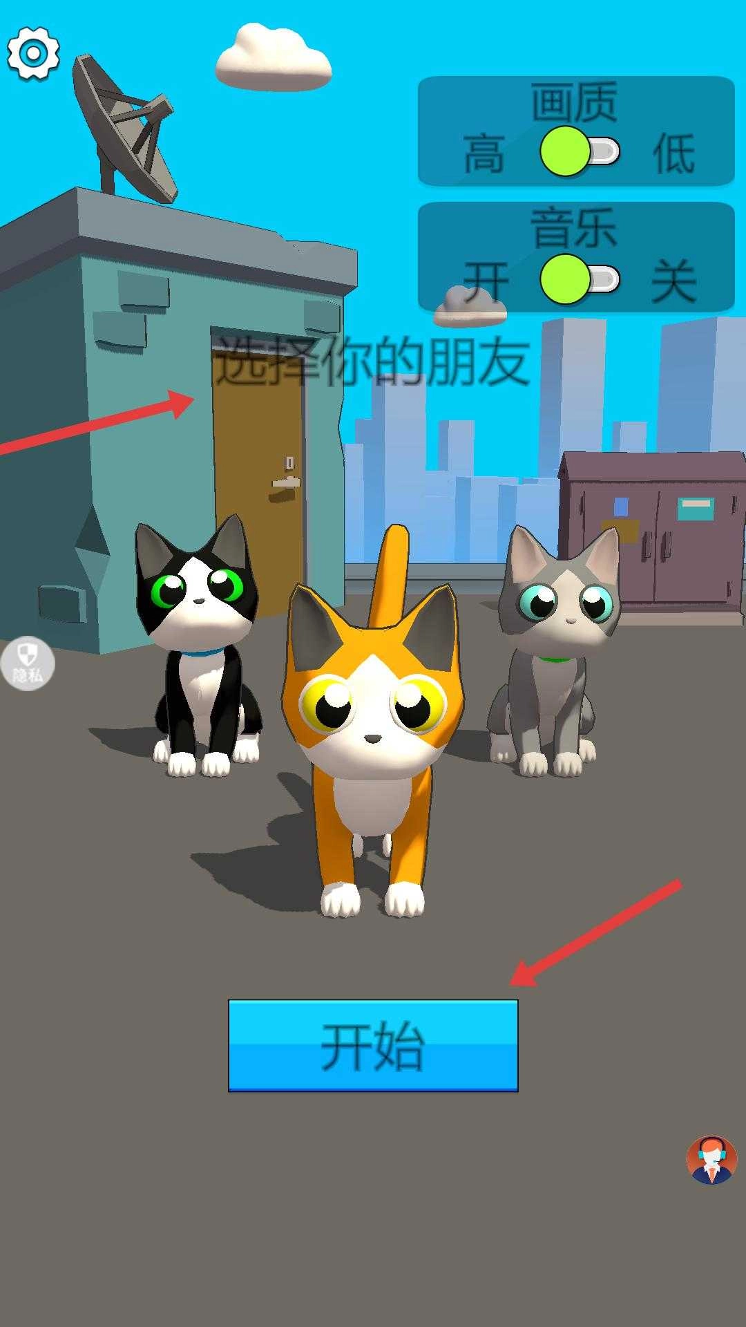 进入游戏后,你可以挑选猫咪作为伙伴,也能对画质和音乐设置进行调整,等这些都设置好后,点击开始按钮,就能开启一段充满未知的冒险之旅了。