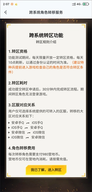 进入系统转移流程后,请仔细阅读系统角色转移服务的相关内容,随后点击“我已了解,进入转区”按钮。