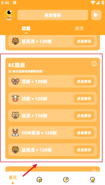 向下滑动页面,找到EC画质板块后点击“120+超清画质”选项,即可完成设置修改。