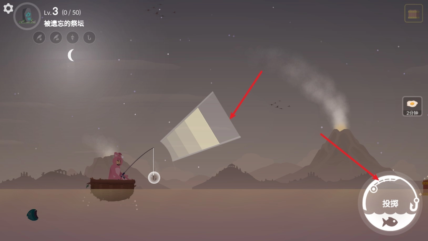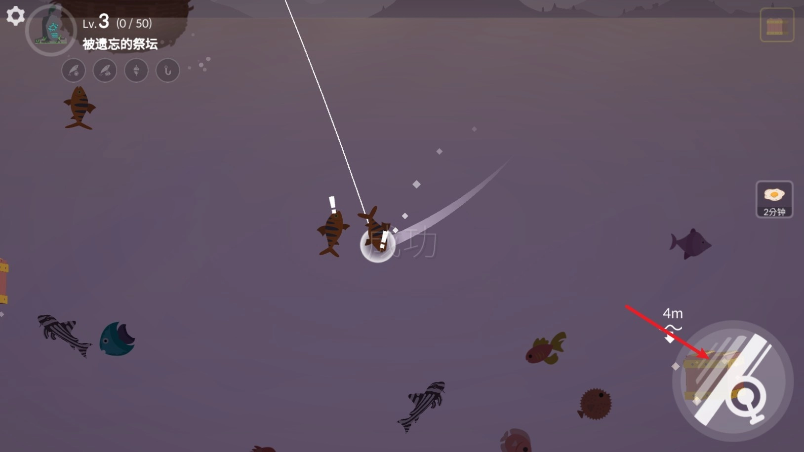 鱼儿上钩后,点击右下角的按钮就能收杆。