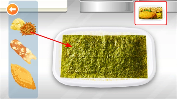在组装便当的过程中,点击左侧像炸物、炒丝这类配菜,把它们放到铺着海苔的米饭上,以此完成便当的组装,制作出一份完整的海苔便当。