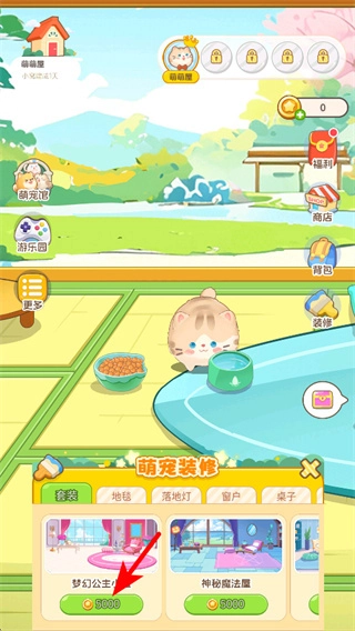 1、在养成界面,点击底部的猫咪形象按钮进入萌宠装扮界面,消耗金币解锁不同风格的装扮,装饰猫咪的生活场景。