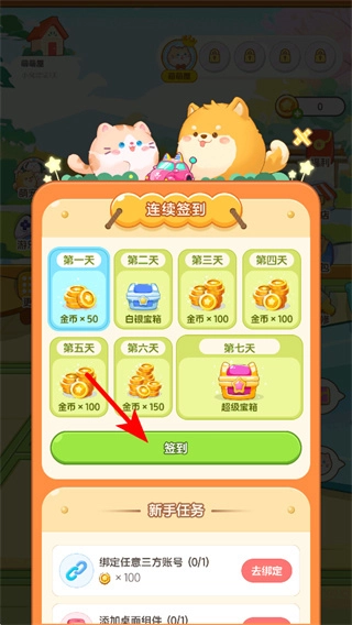 2、进入连续签到界面后,点击签到按钮领取当日奖励,积累资源用于猫咪养成或场景装扮,后续可每日签到获取更多福利。