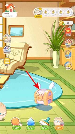 3、完成签到后,回到养成场景,点击出现的宝箱类道具开启奖励,获取金币、道具等资源,助力猫咪的养成进度场景装饰。