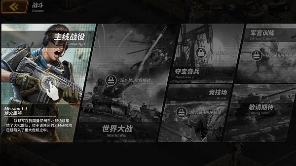 游戏设有多种模式可供选择,除了作为核心的战役模式外,还有世界大战、夺宝奇兵、竞技场等玩法,能够满足不同玩家的多样化体验需求。
