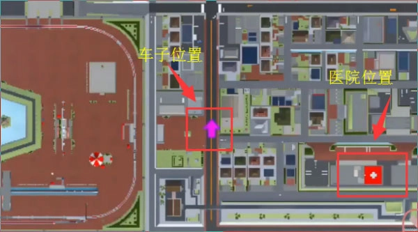 3、可以打开地图看见箭头的位置就是救护车的位置,医院的位置就是十字号的位置;