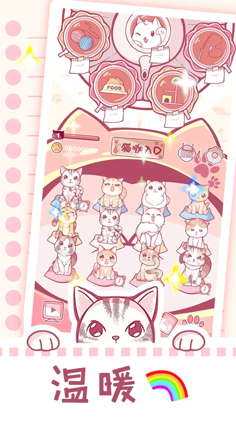 1、整体画风走的是软萌q版路线,猫咪时不时会偷偷眨眼睛,还带着奶乎乎的小嗓音。哎呀,这也太软乎乎了,简直像在心里轻轻挠痒痒似的,让人忍不住想把金币都掏出来把它们全买下。