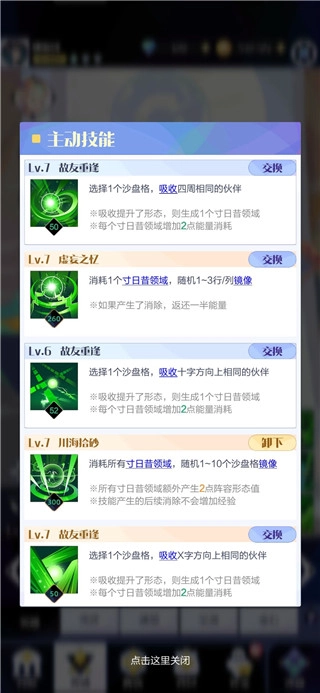 这套技能组旨在使强伙伴的方块通过镜像的方式覆盖大片沙盘,从而合成高级伙伴。三个消除类技能选择手感合适的即可,虚妄之忆用于能量不足的情况进行小规模镜像(如竞技场中每轮稳定爆发),可按个人喜好替换为消耗类技能。