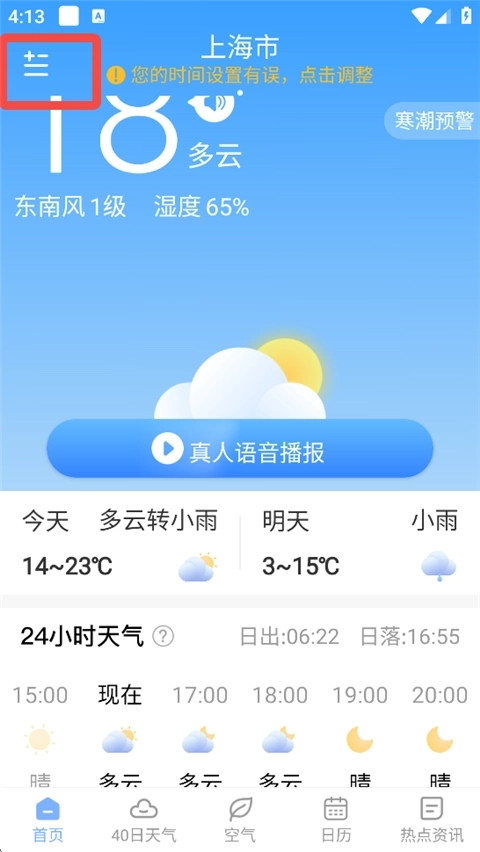 1、打开朗朗天气,点击左上方图标。