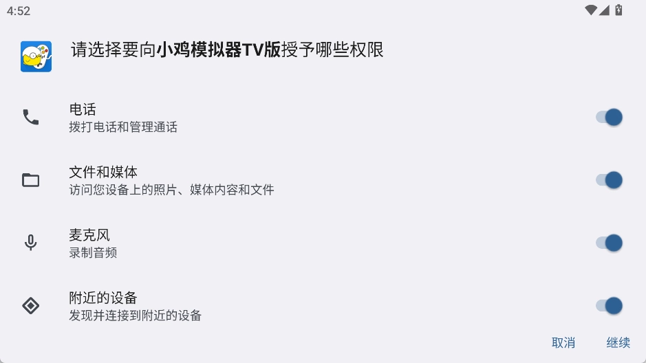 1、安装好小鸡模拟器TV版后打开,点击继续