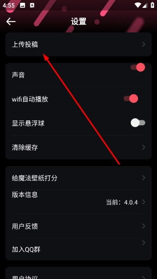 1、打开应用的设置页面,找到并点击“上传投稿”选项,即可进入投稿上传的说明界面。