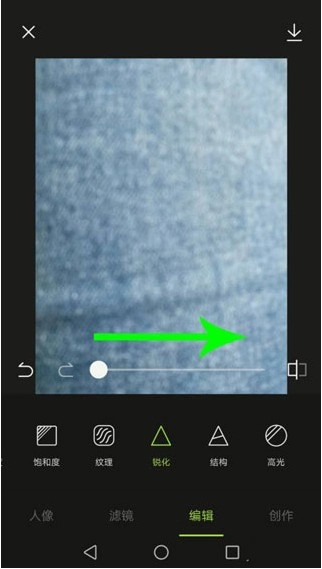6、开启锐化工具后,把白色圆球向右拖动,以此增强锐化效果,从而使照片更清晰。