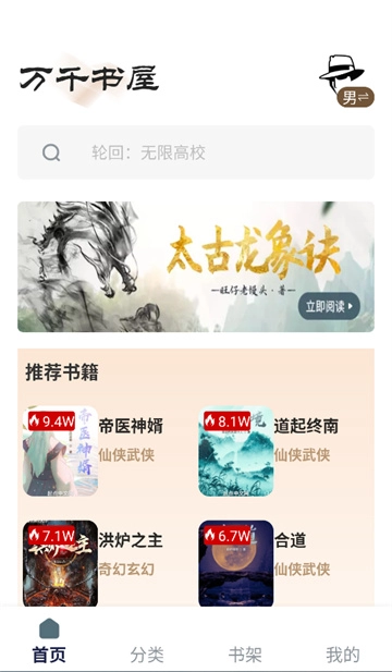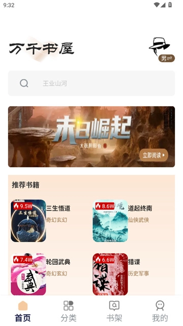 推荐书籍清单:以下为您呈现仙侠、玄幻等不同类别的热门书籍推荐,同时标注了“9.4W”这类阅读热度数据,助力您轻松筛选出高人气作品。