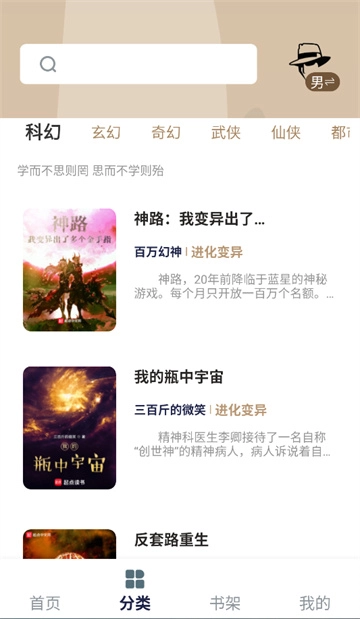书籍列表与简介:在每个分类下,会列出相关书籍(如《神路:我变异出了...》、《我的瓶中宇宙》),并附带书籍简介,帮助您快速了解内容。