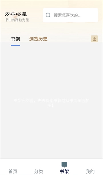 书架:用于存放您自行添加的书籍。首次使用时会显示提示语:“书架目前是空的,您可以通过搜索书籍或从书城添加来充实它!”