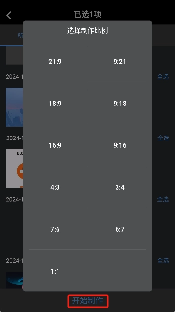 3. 点击“开始制作”,并选择制作的视频比例。