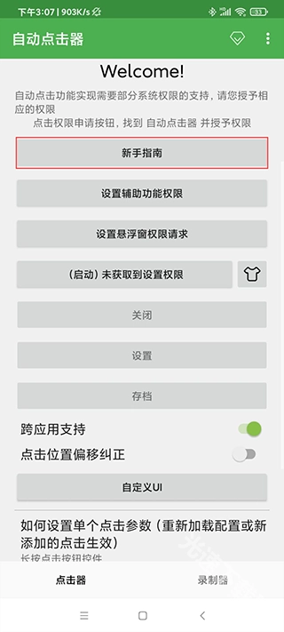 1、打开在3322的“自动连点器”,在首页这里有“新手指南”,可以查看使用指引;使用时首先要点击“设置辅助功能权限”。