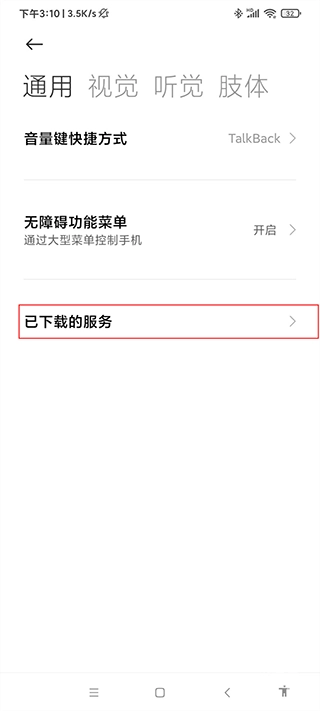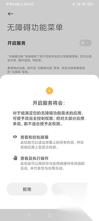 2、点击“辅助功能权限”后,找到“无障碍功能菜单”,是默认关闭的,需要开启;