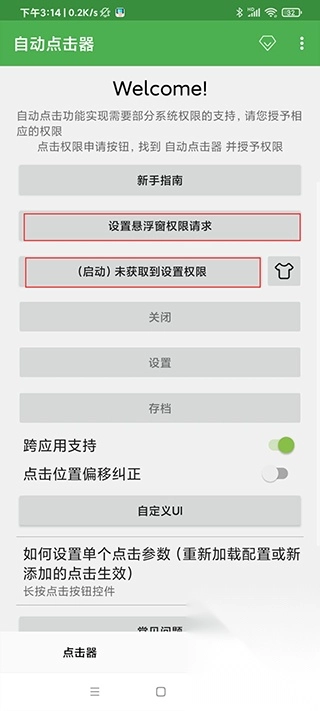 7、然后返回首页,可以看到未设置权限,需要“设置悬浮窗权限请求”,设置即可;