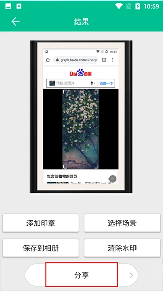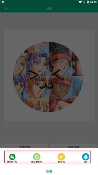 3、编辑好之后,点击右上角“完成"按钮会保存图片跳转到保存和分享界面,用户可以把作品保存到相册,也可以分享到微信或QQ,还可以按自己的喜好对结果进行添加印章、添加文字、添加场景操作。