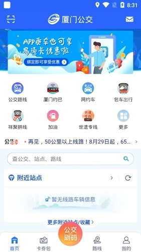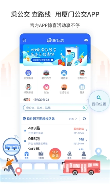 厦门公交是一款由厦门公交集团掌上行科技有限公司开发的公共交通出行服务手机软件,该软件致力于整合公交集团的全部服务资源,为广大用户们提供多类型交通出行服务。该软件中有着公交站点和线路查询,手机刷码乘公交,充电和加油、维修、施救、检测等多项服务。各位用户们只需要带一部手机就可以坐车,方便快捷。