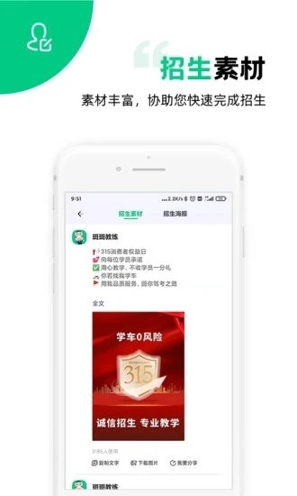 斑斑教练是一款专为学车教练打造的管理,拥有丰富的招生素材和海报可以使用,用户可以在手机上查看每天和每月的招生数以及收入,功能十分强大,有需要的朋友快来吧!?