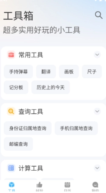 随身工具箱的界面设计得简洁又美观,各项功能分区清晰明了,还配备了搜索按钮,能让你轻松定位到想要的功能,几乎不需要花时间学习,打开就能直接使用。虽说它集成了这么丰富的内容,但软件占用的内存却依旧极小,只能说一句,太厉害了!