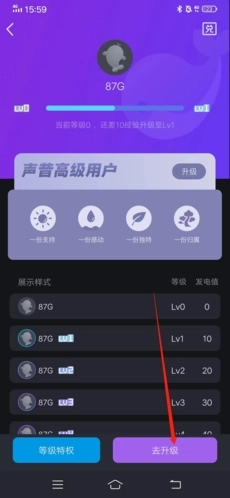 2、这样我们就进入等级页面了,用户能查看自己距离升级还缺多少经验,接着让我们点击下方的“去升级”按钮。
