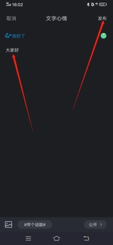 2、进入编辑页面后,输入想要分享的文字心情,检查确认内容无误,接着点击右上角的“发布”按钮,如此一来,我们的文字就能成功发布出去了。