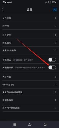 2、进入设置页面后,把“屏蔽通讯录”右侧的选项勾选起来,如此一来,我们在使用声昔的过程中就不会看到通讯录里的好友了。