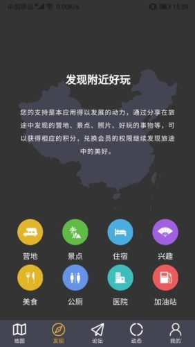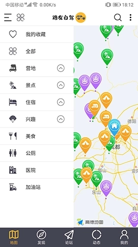 5、整合了自驾游所需的各类资源与图标,涵盖景点、营地、厕所、美食、酒店等方面;