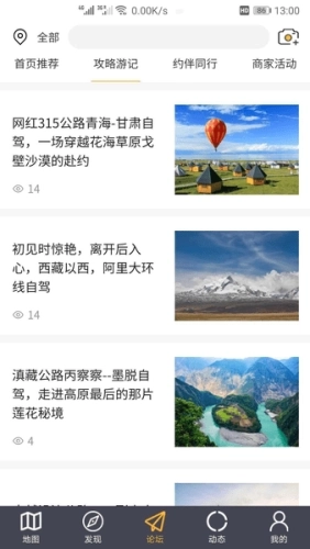 1、论坛里设有多个栏目,包含约伴同行、商家活动、攻略游记等不同类型的文章。