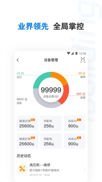 专业设备实时监控:楼宇卫士可对暖通空调、供配电、给排水、消防、电梯扶梯、智能化设备等的健康状态进行实时监控。